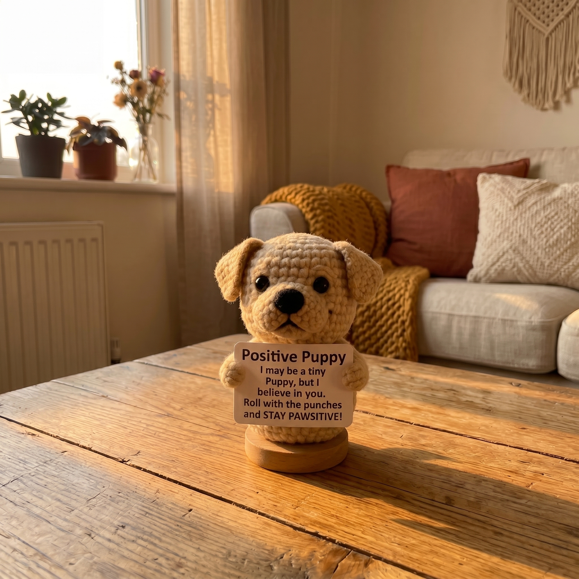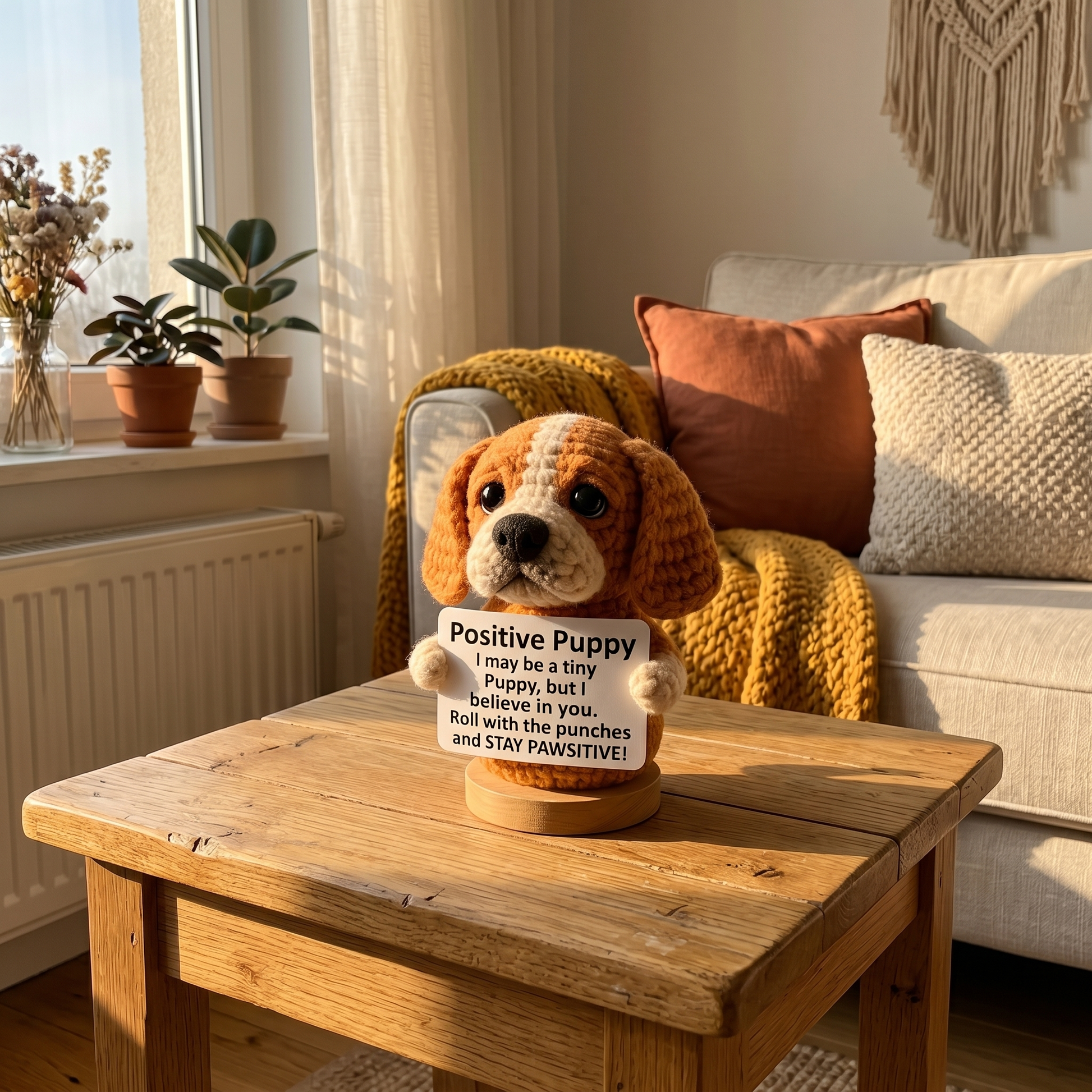 Each puppy is crocheted by hand using soft yarn. The base is a small wooden stand. All materials are safe and non-toxic.